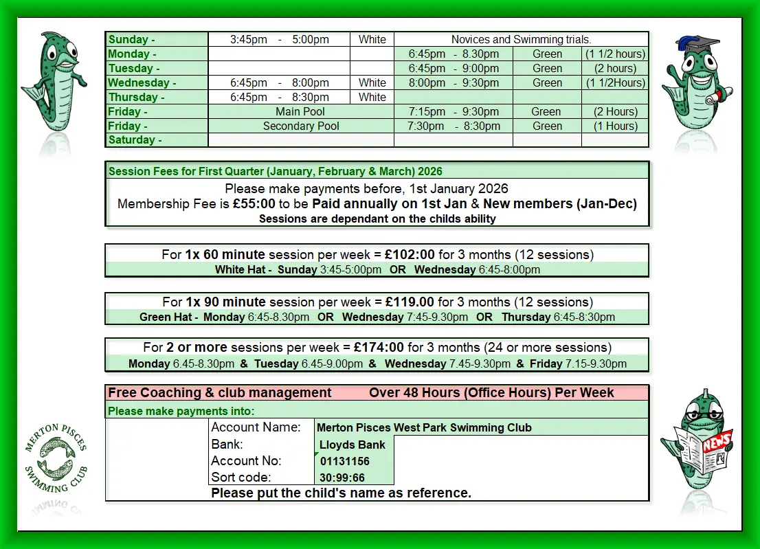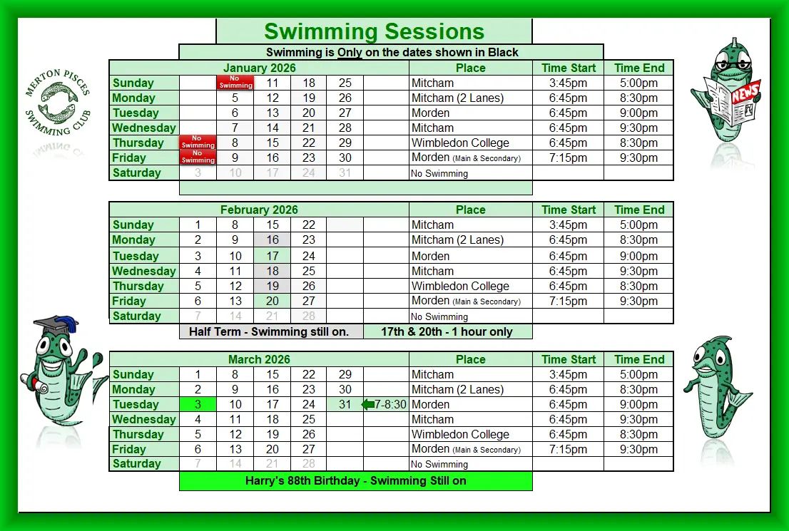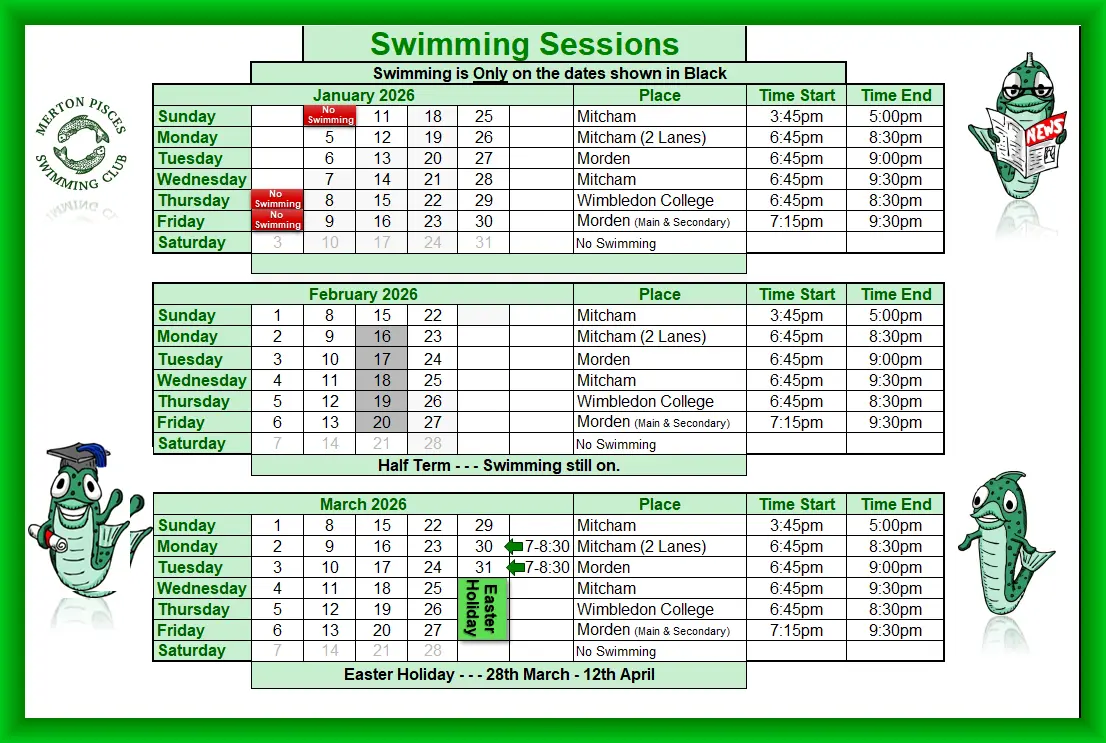 All your swimming sessions for the first Quarter of 2026 January, February & March.