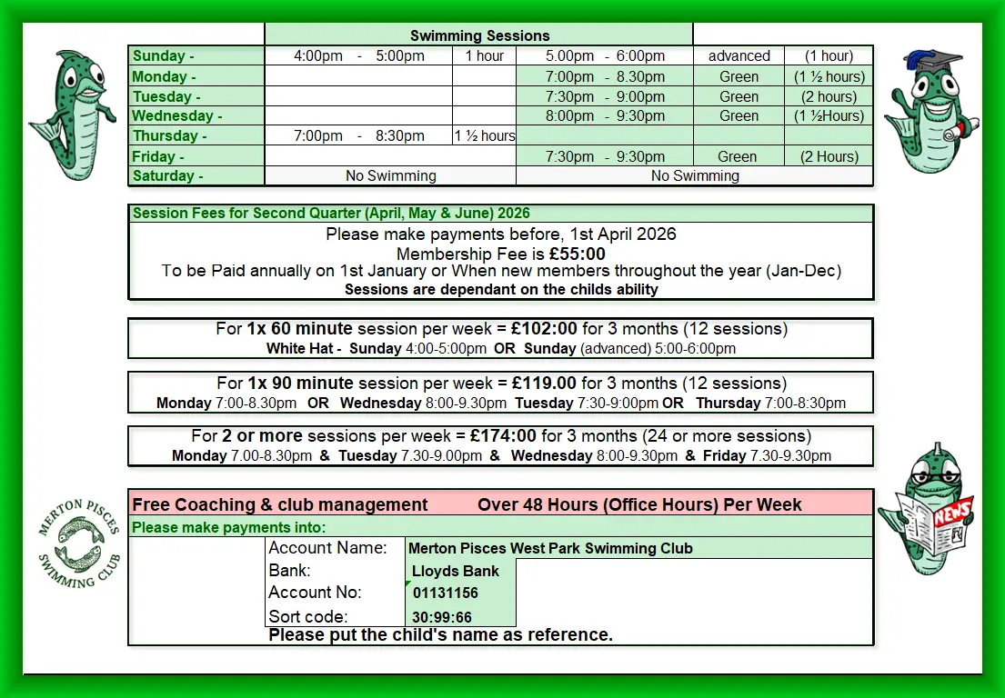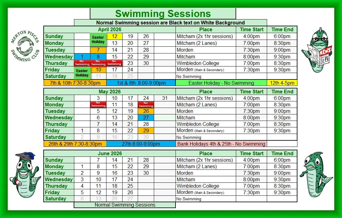 All your swimming sessions for the second Quarter of 2026 April, May & June. Payment details can be found on the Prices & Payment Page or at the bottom of this one.