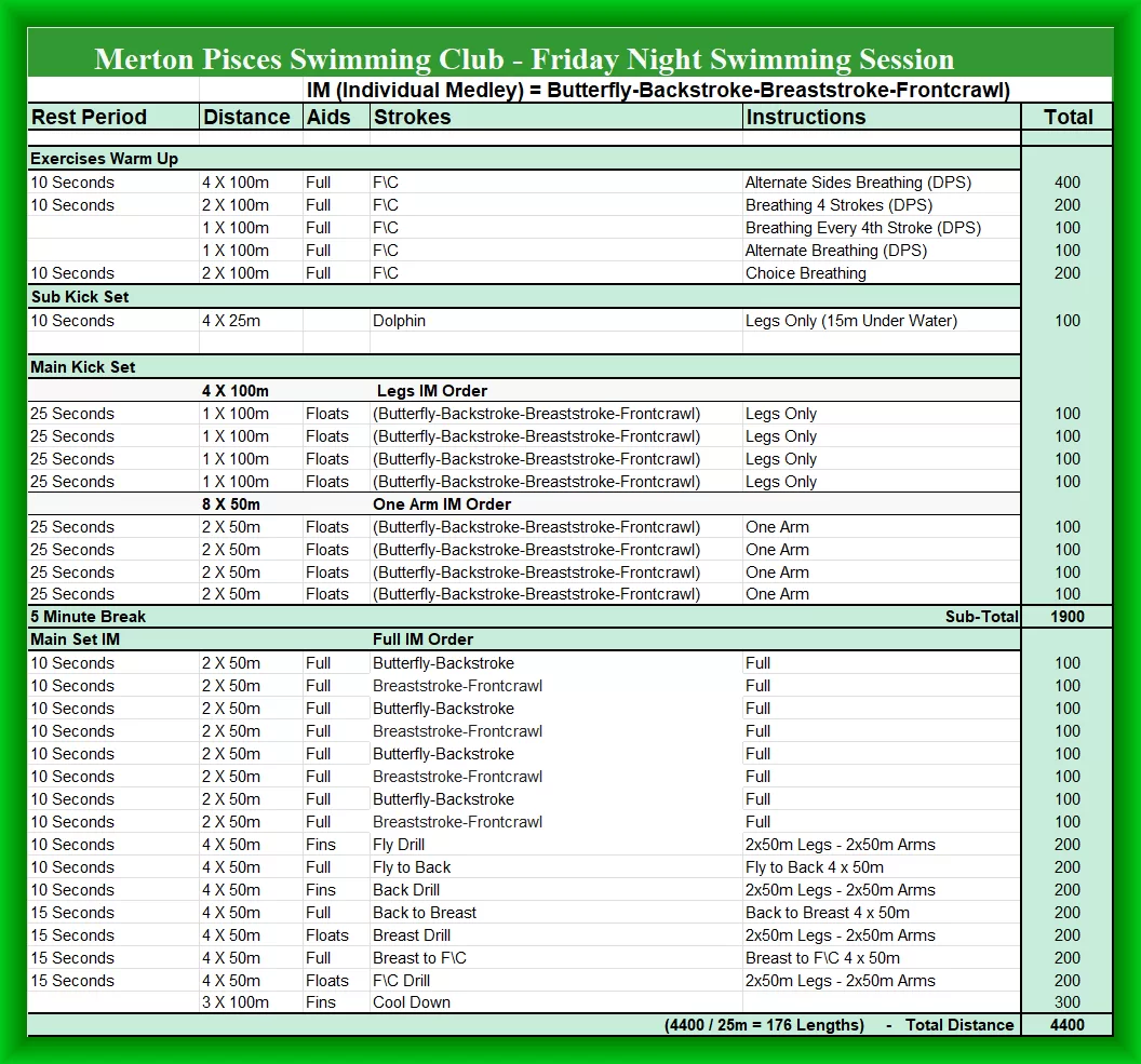 For Example, this image contains a typical Friday night swimming session and how it is split up. As you will see there is no much time for talking as it is quite intensive. This is why we can’t just let anyone attend these sessions as many children are not able to keep up. Even some of our good swimmers that attend often struggle.