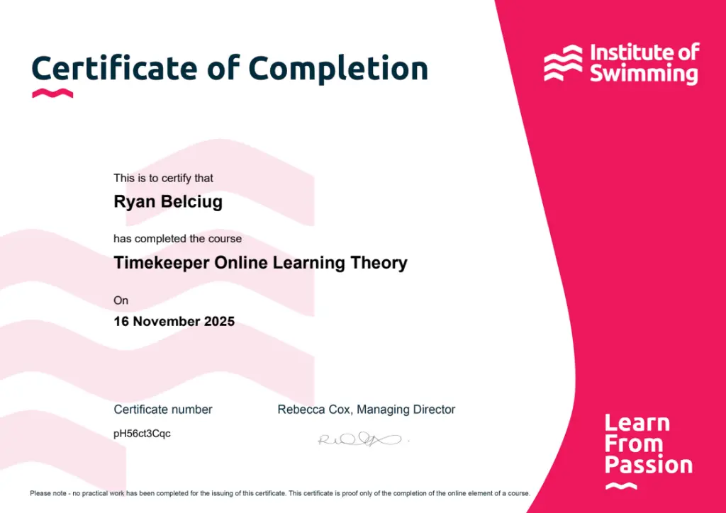 Ryan started as a normal member of the club and has progressed through all the stages of training to be a great swimmer. But he has now taken and passed both (Level 1)Assistant Teaching, (Level 2)Teaching Swimming courses required to become a Swimming Teacher and is helping in club sessions